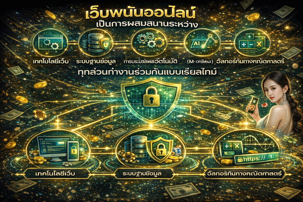 เว็บพนันออนไลน์เป็นการผสมผสานระหว่างเทคโนโลยีเว็บ ระบบฐานข้อมูล การประมวลผลอัตโนมัติ และอัลกอริทึมทางคณิตศาสตร์ ทุกส่วนทำงานร่วมกันแบบเรียลไทม์ ตั้งแต่การสมัครสมาชิก ฝากเงิน เลือกเกม ไปจนถึงการคำนวณผลและถอนเงิน